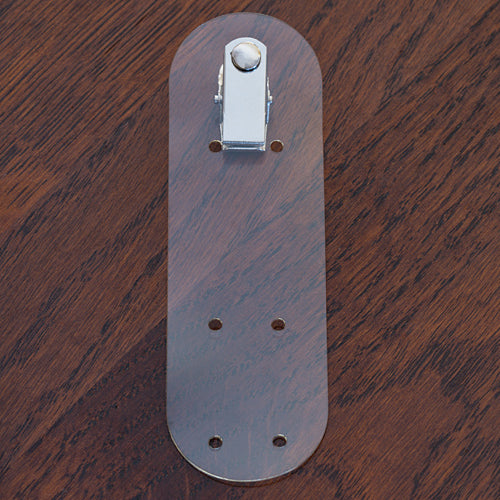 Clear plastic tab with alligator clip. 1.25" x 2.5" with three sets of holes for multiple placement options.